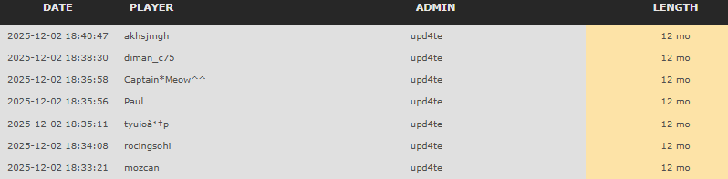 - Es kamen 6 Bots (ausländische SPieler) auf den Server und haben im Voicechat gespammt mit lauter Musik und dann alle votegebannt die derzeit auf dem Server waren. Sprich wir alle wurden willkürlich gebannt.